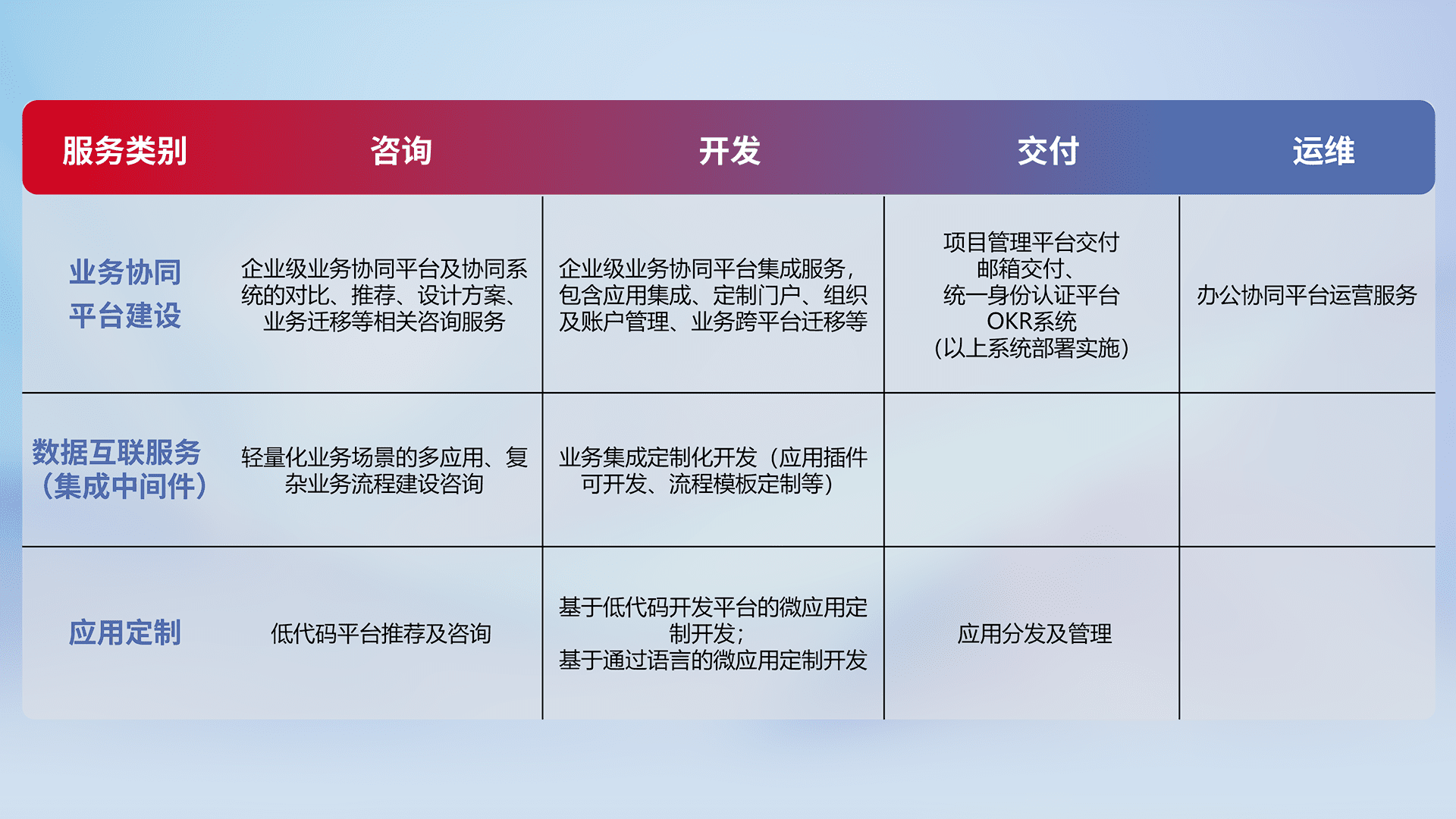 针对钉钉、、、、企微、、IDaas等平台级产品提供产品的规划、、、方案、、、交付、、、定制化开发等服务,,,实现如统一协同办公、、、、智能客户服务、、混合会议管理、、、智能数据查询、、等业务场景,,,实现数字化转型。。。